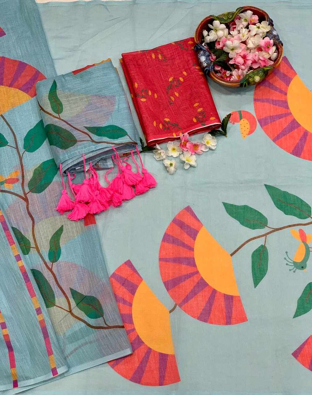 Saree Fabric: Premium Linen Cotton with beautiful digital print and elegant handmade cotton tassels