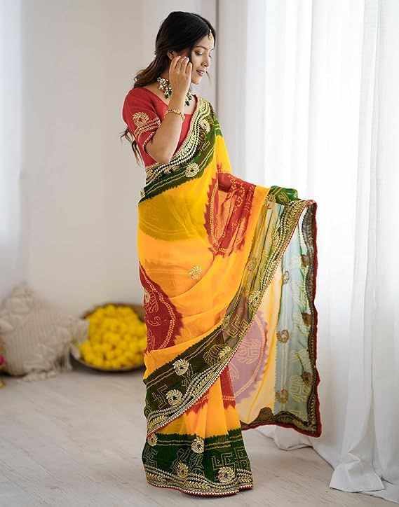 | Name : | PIYU P1030 mor bandhani Yellow-Red Saree |