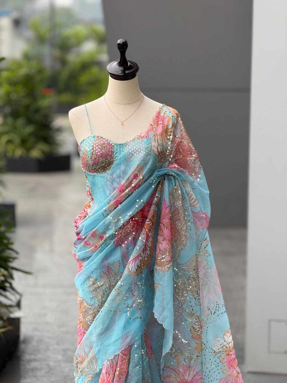 Saree – Pure Jimmy Organza digital printed saree embellished with beautiful sequins work, giving it a graceful and festive appeal